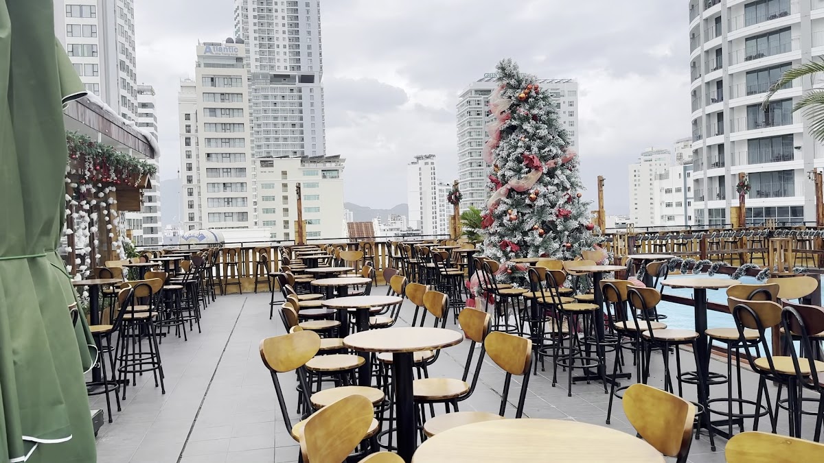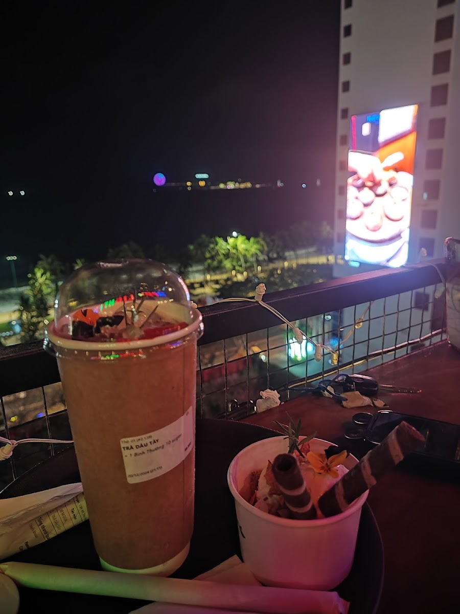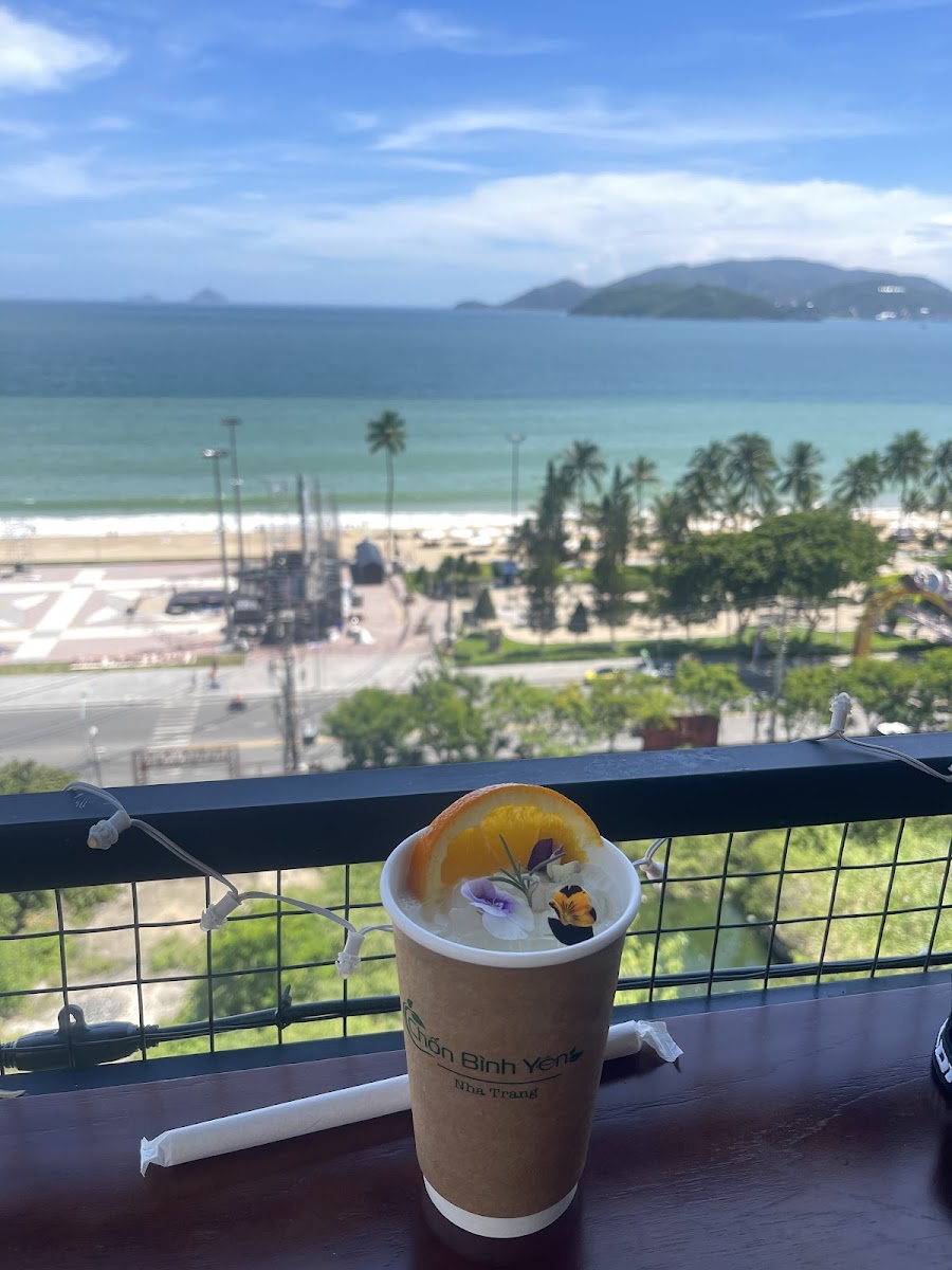 It's a hidden gem in Nha Trang. You enter through a small alley to reach the scooter parking, then take the elevator up to the café. The place is simple, but it offers a chill view of the sea and the square. You order drinks at the counter — the drinks were decent.