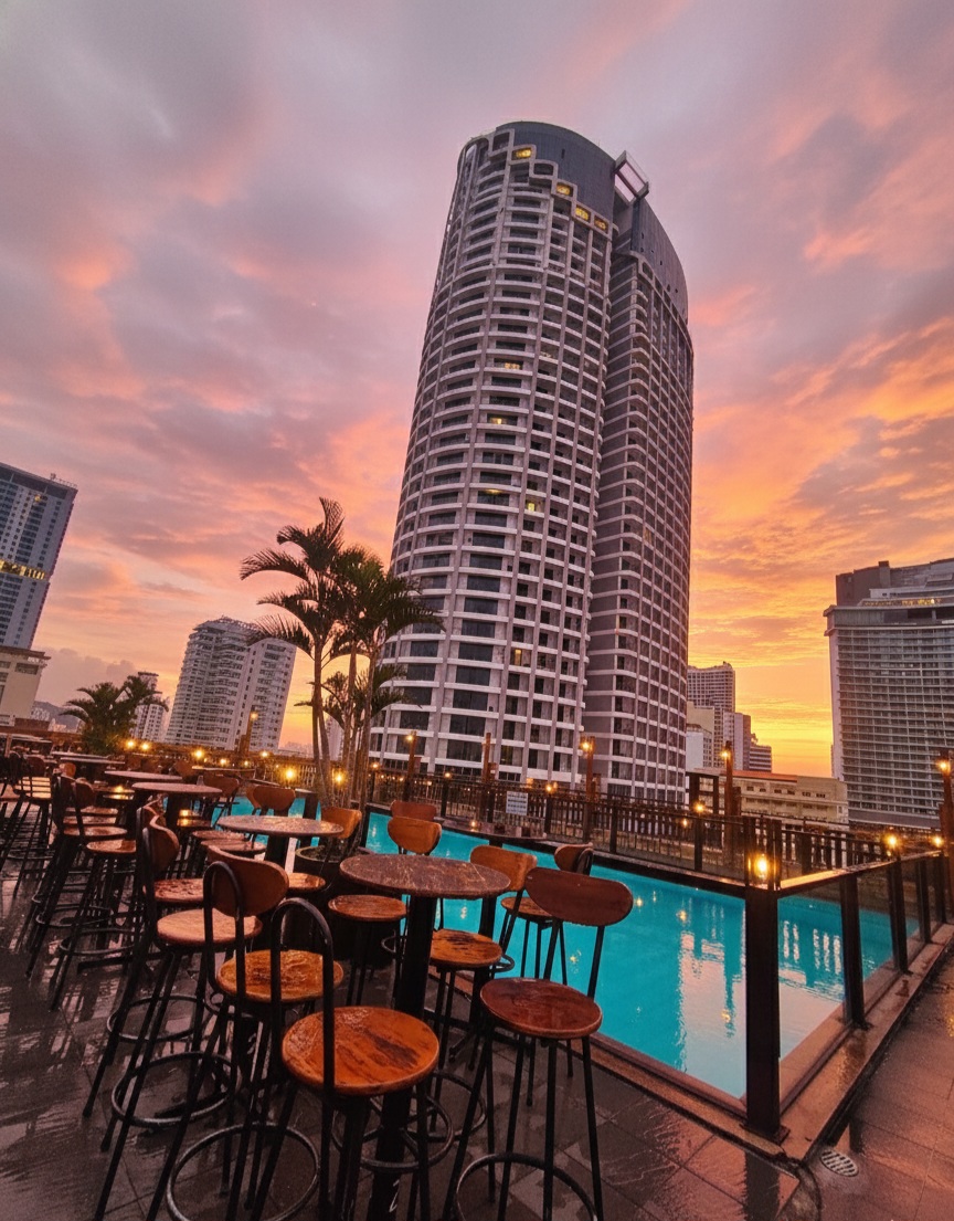 This is a place where the atmosphere is shaped as much by the light and breeze as by the simple act of savoring a drink. Whether settling into a seat by the poolside with expansive views of the coastline and city skyline, or choosing the warmth of the cozy indoor corner, the mood remains contemplative and relaxed. It’s a spot for lingering—that quiet, liminal pause in a busy day—where you can watch the sky glow into evening or bask in the morning’s fresh air.